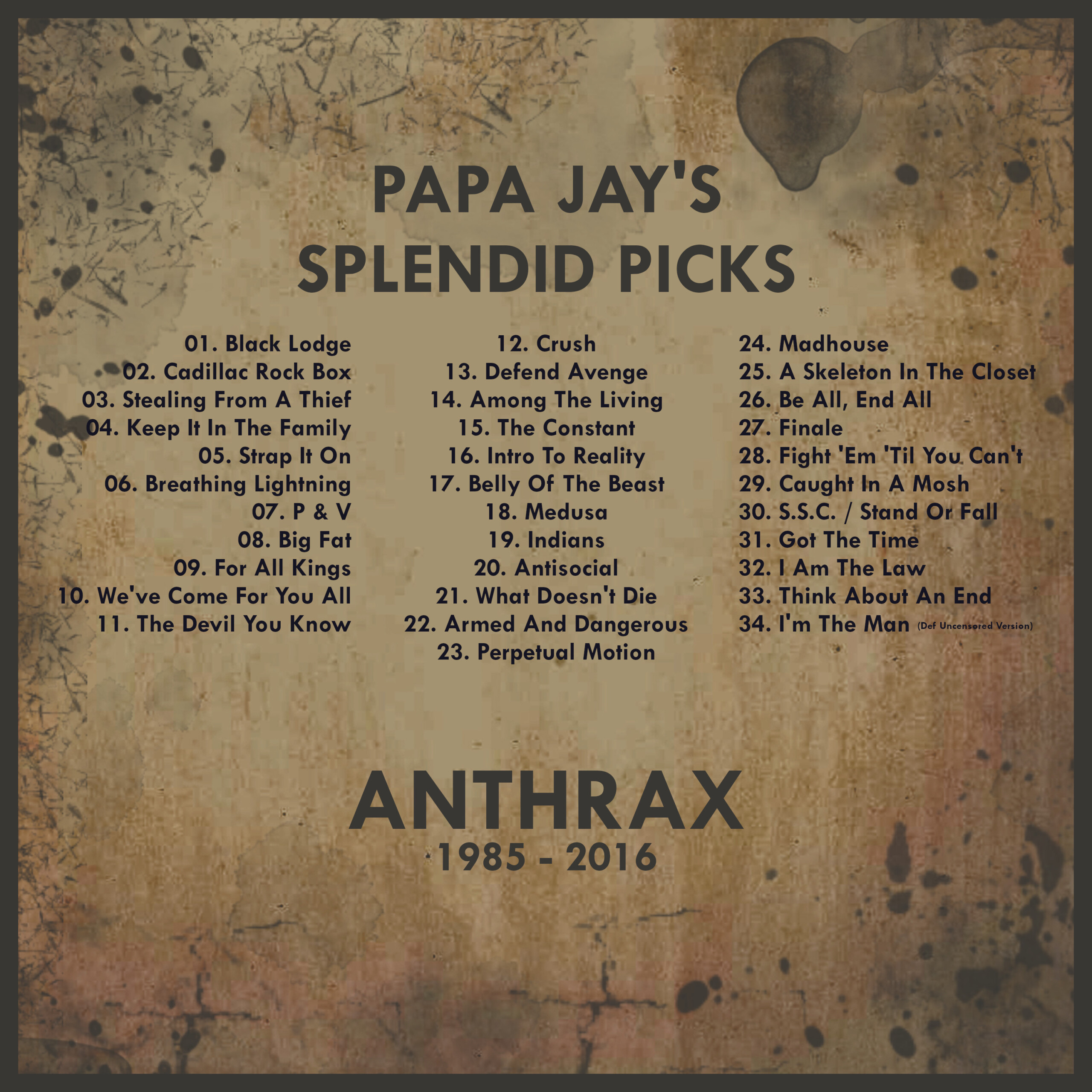My favourite songs by Thrash Metal legends Anthrax taken from their albums/EPs “Spreading The Disease”, “I’m The Man”, “Among The Living”, “State Of Euphoria”, “Persistence Of Time”, “Sound Of White Noise”, “Stomp 442”, “Volume 8: The Threat Is Real”, “We’ve Come For You All”, “Worship Music” and “For All Kings” which have been released between 1985 and 2016.