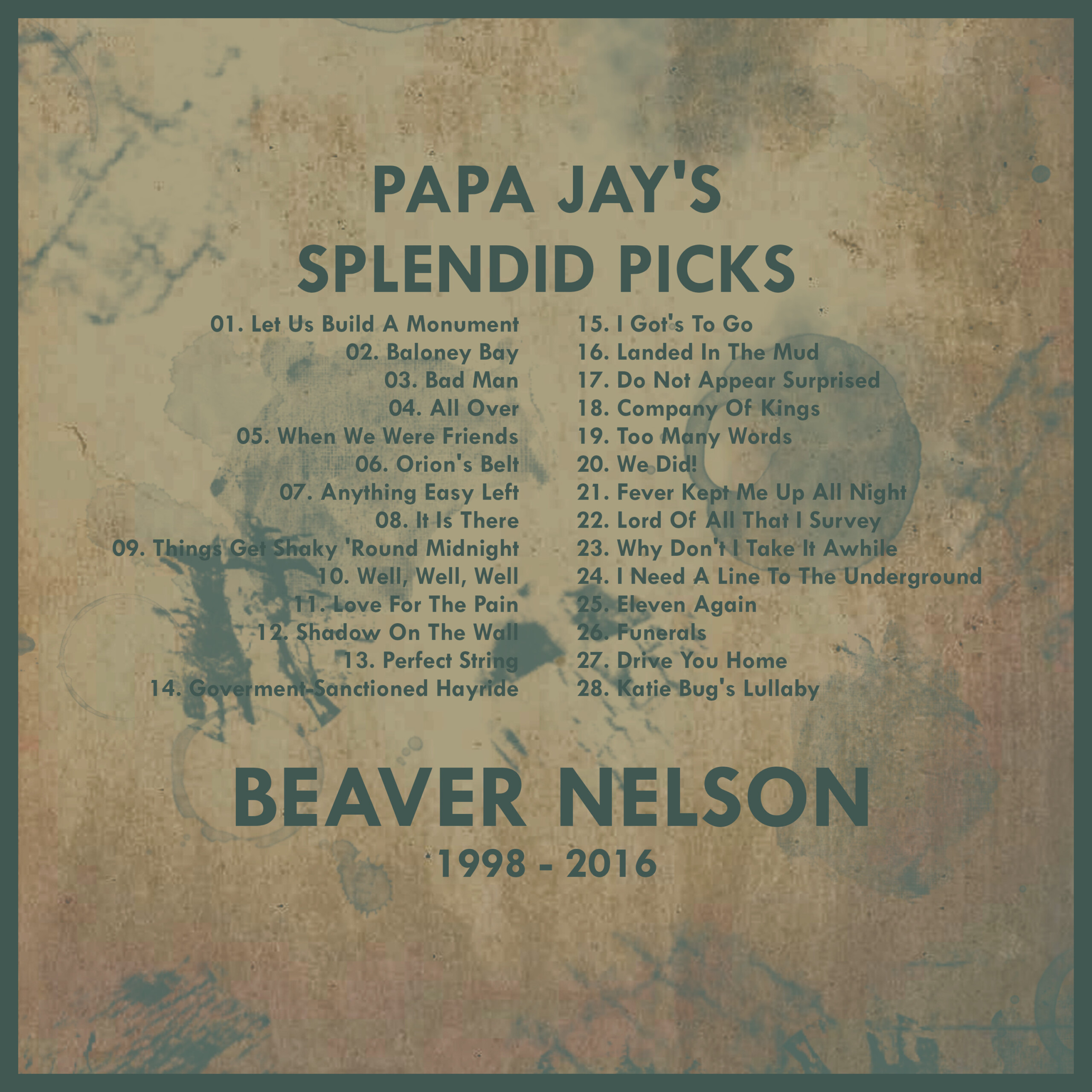 My favourite songs by Beaver Nelson taken from his albums “The Last Hurrah”, “Little Brother”, “Undisturbed”, “Legends Of The Superheroes”, “Exciting Opportunity”, “Motion”, “Macro/Micro” and “Positive”.