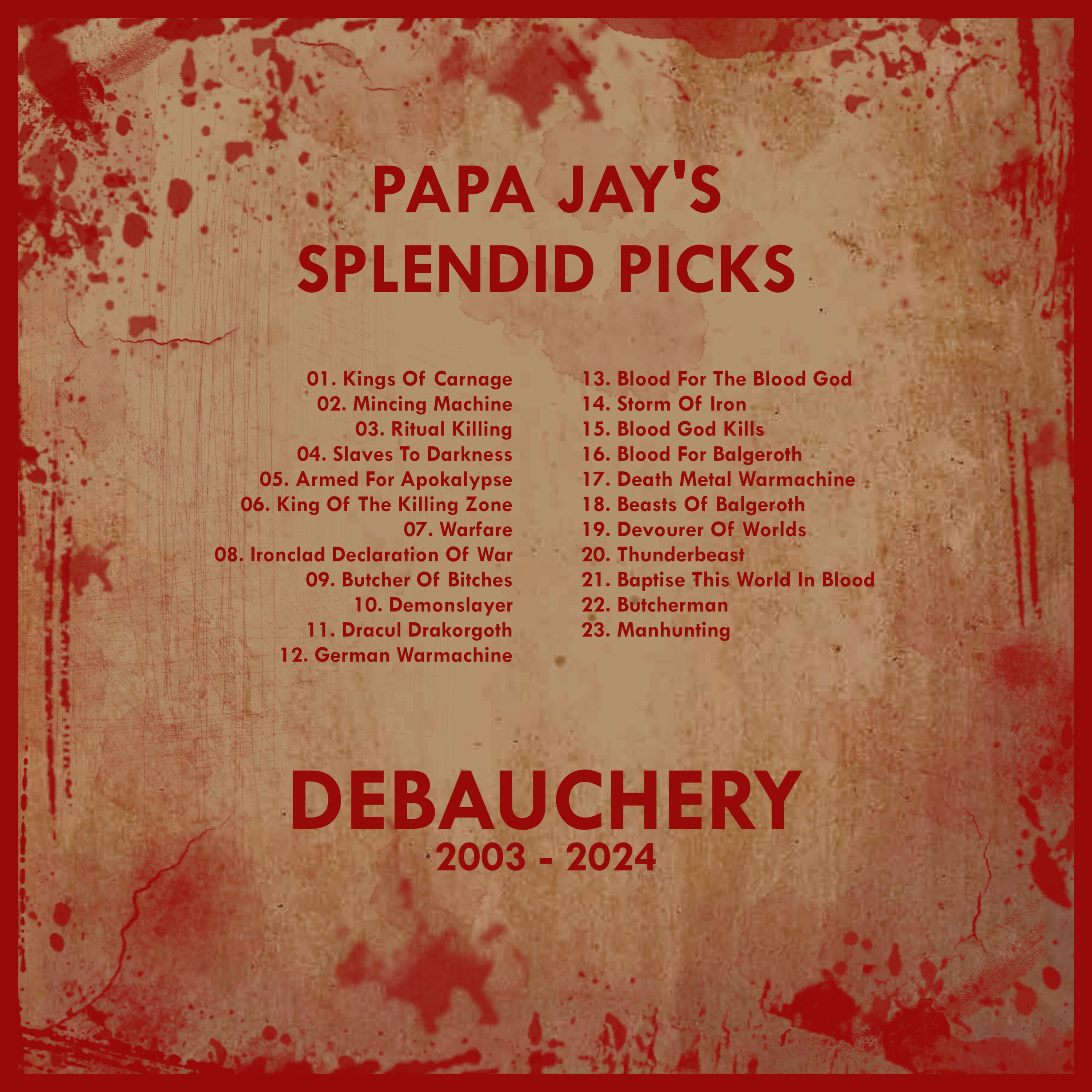 My favourite tracks by Debauchery (including Debauchery Versions of some tracks by other bands of Thomas Gurrath) taken from their albums “Kill Maim Burn”, “Rage Of The Bloodbeast”, “Torture Pit”, “Back In Blood”, “Continue To Kill”, “Germany’s Next Death Metal”, “Kings Of Carnage”, “F*ck Humanity”, “Thunderbeast”, “Blood For The Blood God” and “Dracul Drakorgoth (Debauchery Version)” released between 2003 and 2024