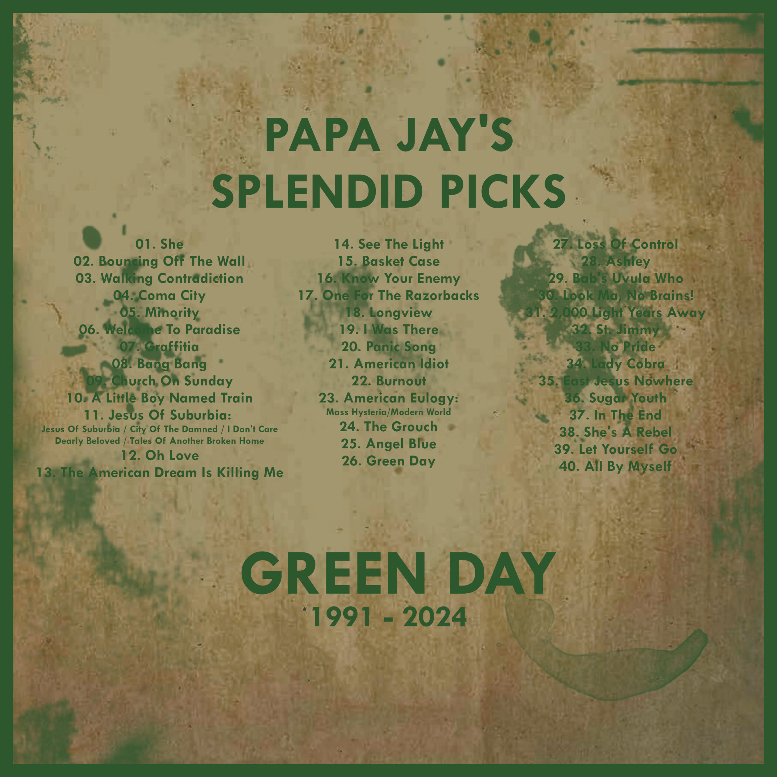 My favourite songs by Green Day taken from their complete catalog starting with their debut “1039/Smoothed Out Slappy Hours” till their 2024 studio album “Saviors”