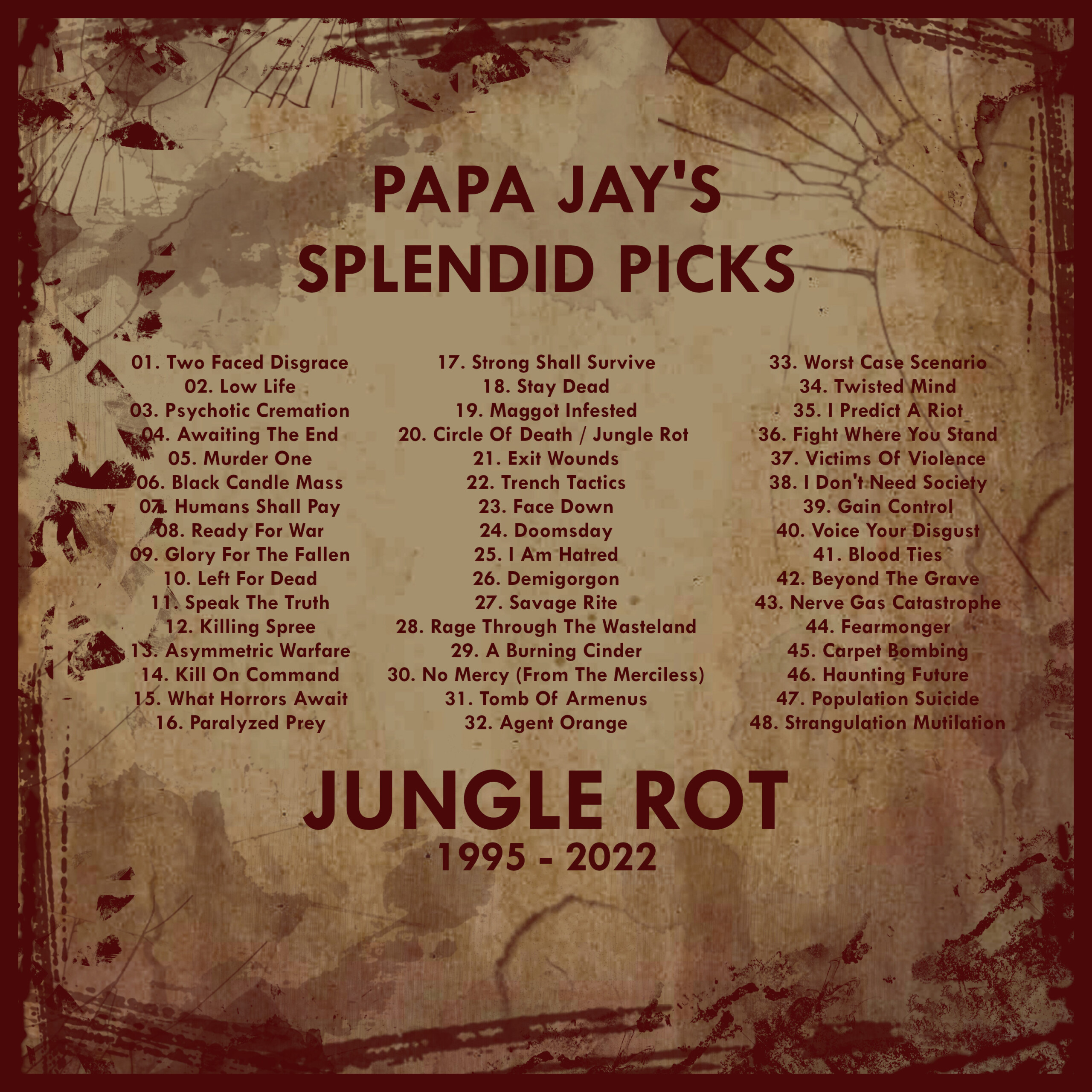 My favourite tracks by Jungle Rot taken from their albums/EPs “Skin The Living”, “Slaughter The Weak”, “Darkness Foretold”, “DEAD AND BURIED”, “Fueled By Hate”, “War Zone”, “What Horrors Await”, “Kill On Command”, “Terror Regime”, “Order Shall Prevail”, “Jungle Rot” and “A Call To Arms” which have been released between 1995 and 2022.