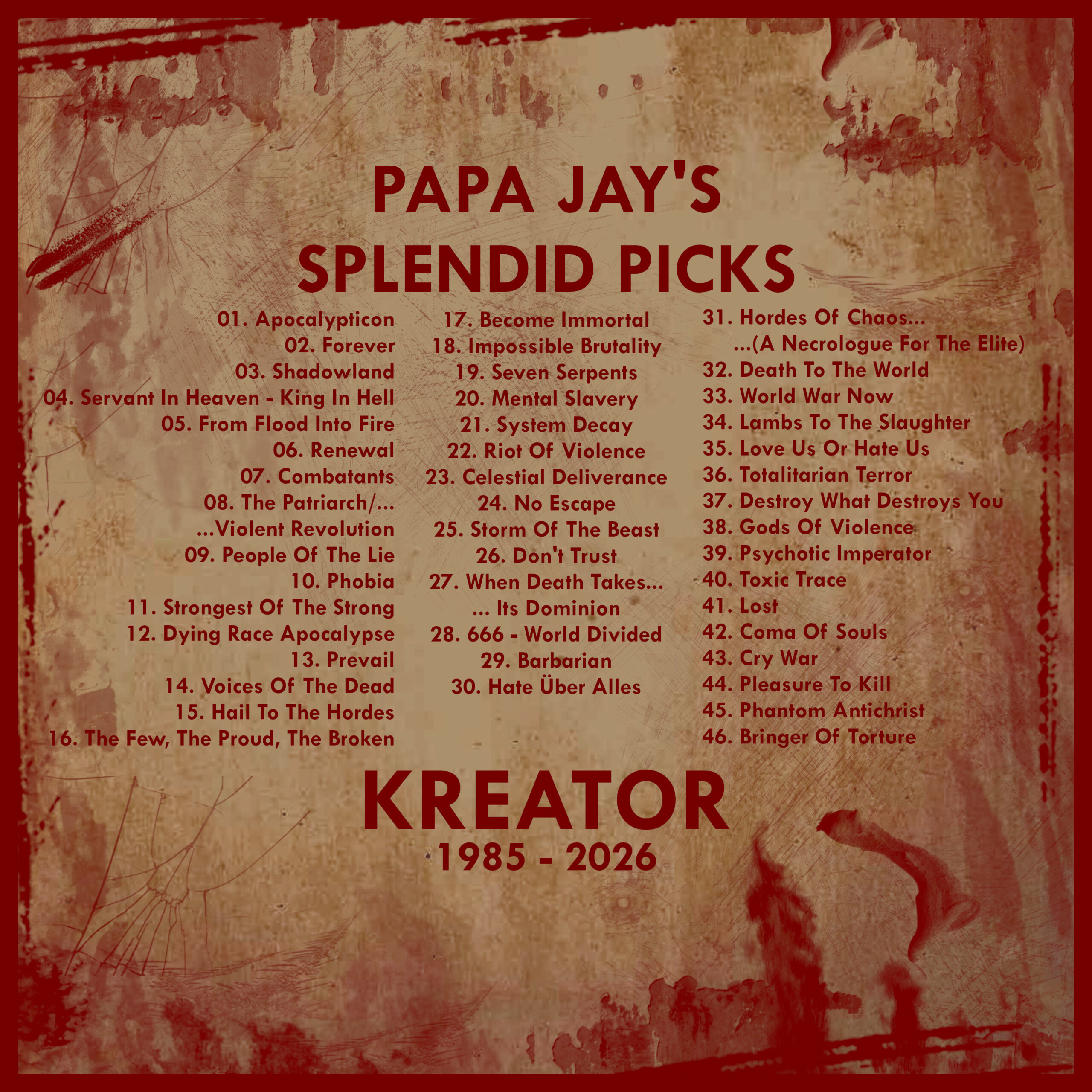 My favourite songs by Kreator taken from their albums/singles “Endless Pain”, “Pleasure To Kill”, “Terrible Certainty”, “Extreme Agression”, “Coma Of Souls”, “Renewal”, “Cause For Conflict”, “Outcast”, “Endorama”, “Violent Revolution”, “Enemy Of God”, “Hordes Of Chaos”, “Phantom Antichrist”, “Gods Of Violence”, “666 – World Divided”, “Hate Über Alles” and “Krushers Of The World” which have been released between 1985 and 2026.