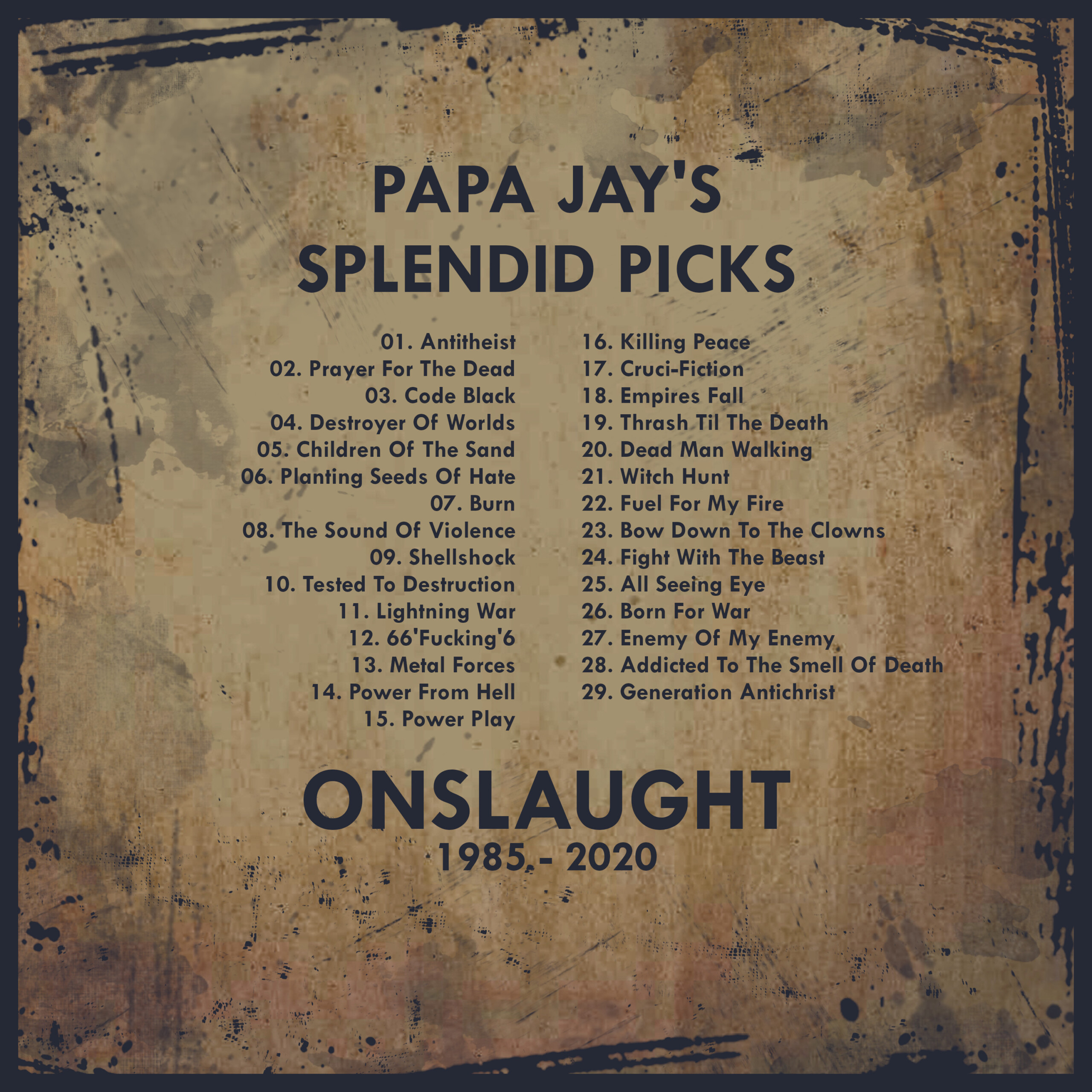 My favourite tracks from Onslaught taken from their albums “Power From Hell”, “The Force”, “In Search Of Sanity”, “Killing Peace”, “Sounds Of Violence”, “VI” and “Generation Antichrist” which have been released between 1985 and 2020.
