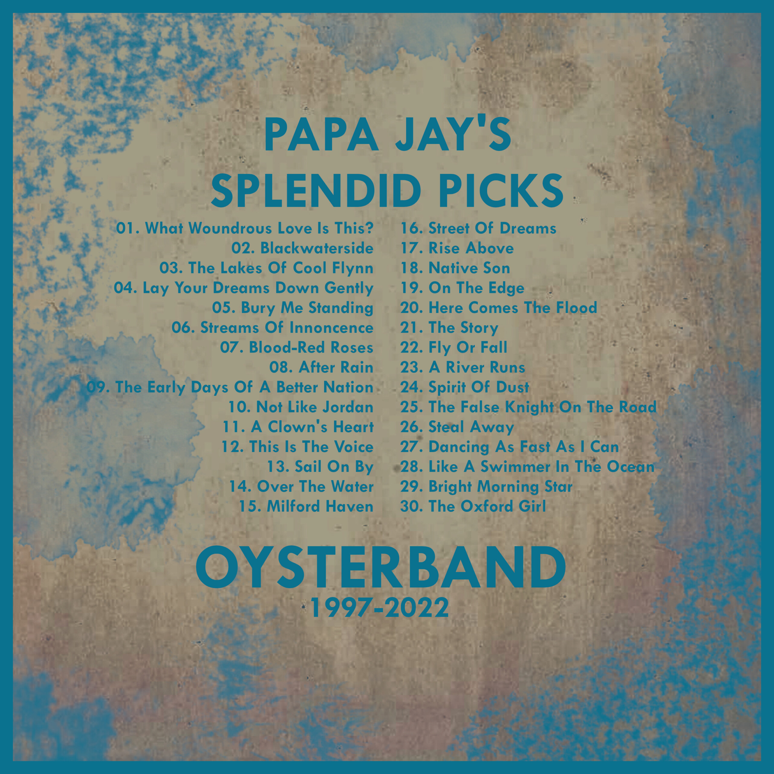 My favourite songs by the wonderful Oysterband taken from their albums “Deep Dark Ocean”, “Here I Stand”, “Rise Above”, “Meet You There”, “The Oxford Girl And Other Stories”, “Diamonds On The Water”, and “Read The Sky” which have been released between 1997 and 2022.