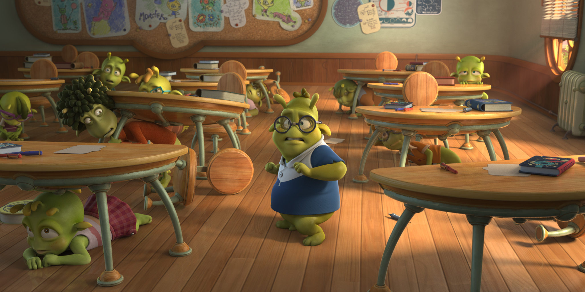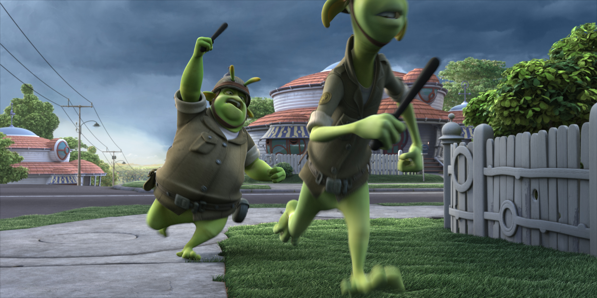 Auf Planet 51 sieht es aus wie auf der Erde in den 50-iger Jahren. Einige Dinge sind allerdings ein wenig anders. Zum Beispiel regnet es Kies, die “Autos” haben keine Räder, sondern schweben über den Boden und die Bewohner sehen wie die sprichwörtlichen kleinen grünen Männchen aus.